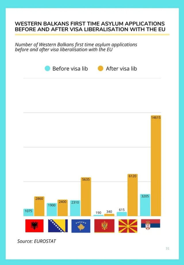 “Ndonëse kërkesat për azil nga Kosova u rritën për 144% në vitin e parë të liberalizimit të vizave, kjo rritje është në fakt mjaft e ultë nëse krahasohet me rritjen e numrit të azilkërkuesve nga vende të tjera të rajonit në vitin e tyre të parë të liberalizmit të vizave. Në rastin e Maqedonisë së Veriut numri i azilkërkuesve u rrit për 895%, në rastin e Serbisë 356%, ndërsa në rastin e Shqipërisë 166%. Vetëm Mali i Zi dhe Bosnja arritën të mbajnë rritjen e numrit të azilkërkuesve nën 100%.”