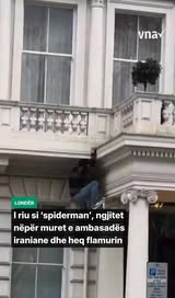 Një i ri në në Londër me aftësi mbresëlënëse për t’u ngjitur nëpër mure, ka hipur lart në murin e ambasadës iraniane dhe ka hequr flamurin e Republikës Islamike të Iranit duke vendosur flamurin e Republikës Monarkike.