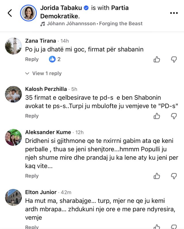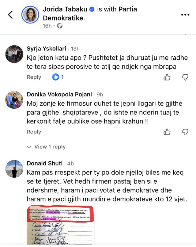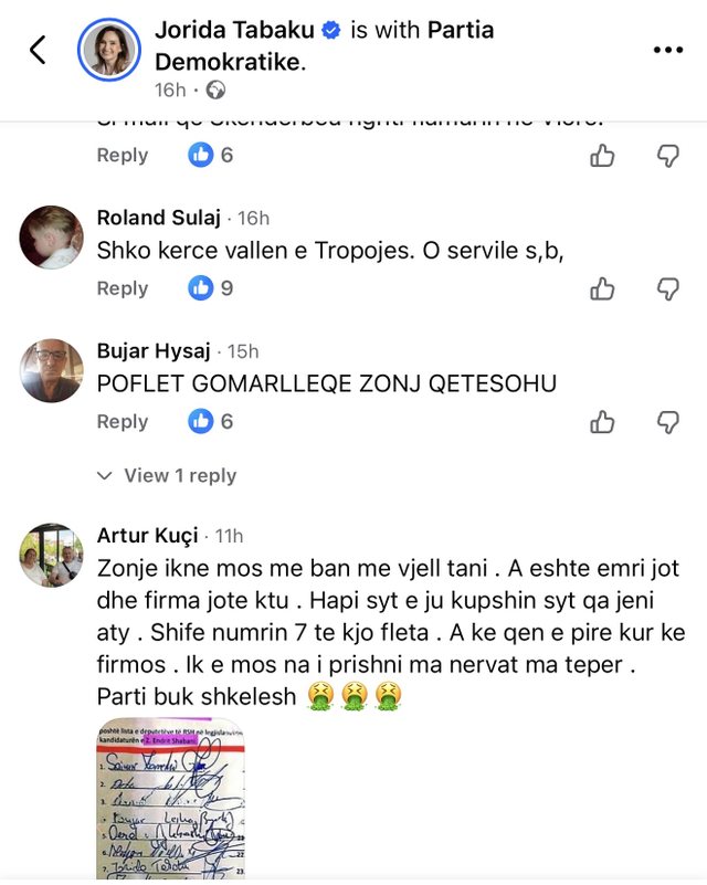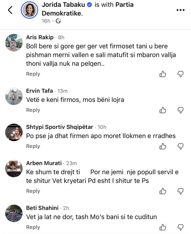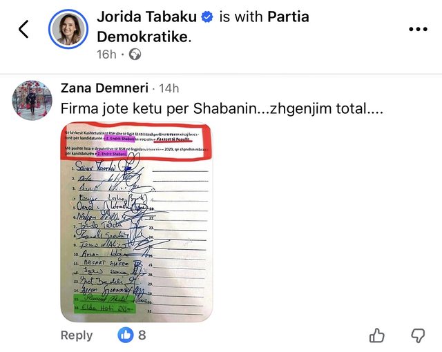However, her statement was considered incoherent, as Tabaku was among the 34 DP deputies who signed Endri Shabani's candidacy for Ombudsman.