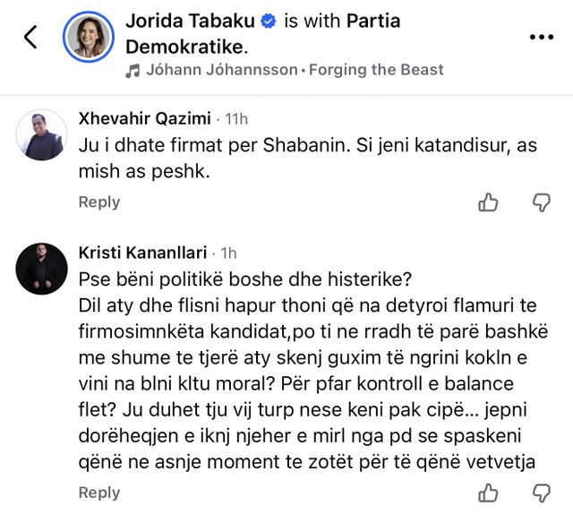 DP MP Jorida Tabaku has faced criticism on social media in a video where she expresses concern about Endri Shabani's candidacy for Ombudsman. Tabaku said: