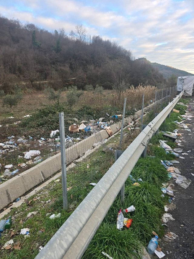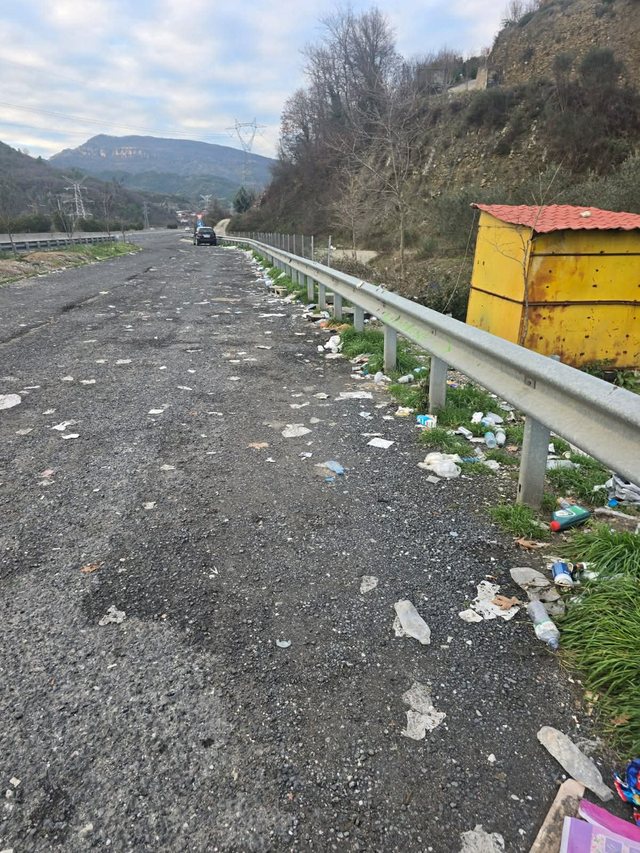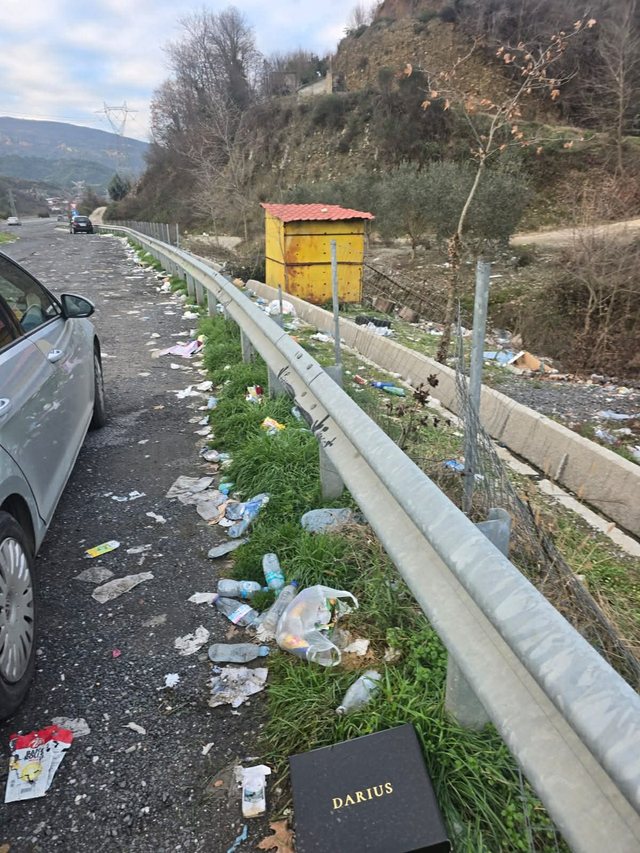Vendpushimi përgjatë aksit kombëtar Elbasan–Tiranë, pak metra para hyrjes së tunelit, është kthyer në një pikë të ndotur alarmante. Siç shihet edhe në foto, zona është e mbuluar nga mbeturina të hedhura pa kriter. Shishe plastike, qese, letra dhe mbetje të tjera janë shpërndarë përgjatë rrugës dhe anës mbrojtëse.