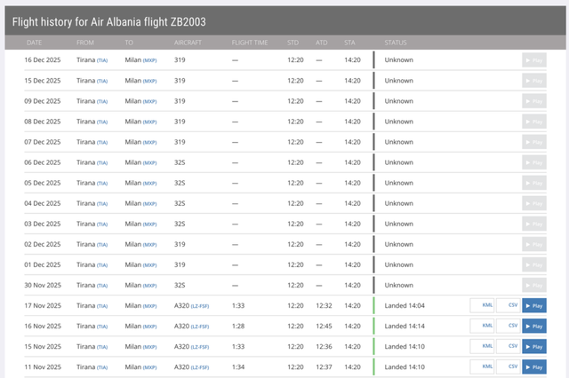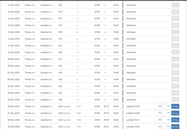 Të dhënat nga Flightradar tregojnë se fluturimi i fundit drejt Milanos është realizuar më 17 nëntor, ndërsa ai drejt Stambollit më 2 dhjetor.