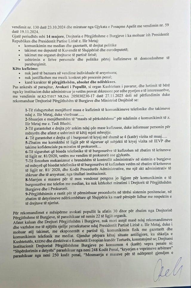 Për të provuar faktin penal, Meta bashkëngjitur kërkesës ka dërguar edhe rekomandimin e Avokatit të Popullit, për trajtimin e personave që ndodhen në paraburgim.