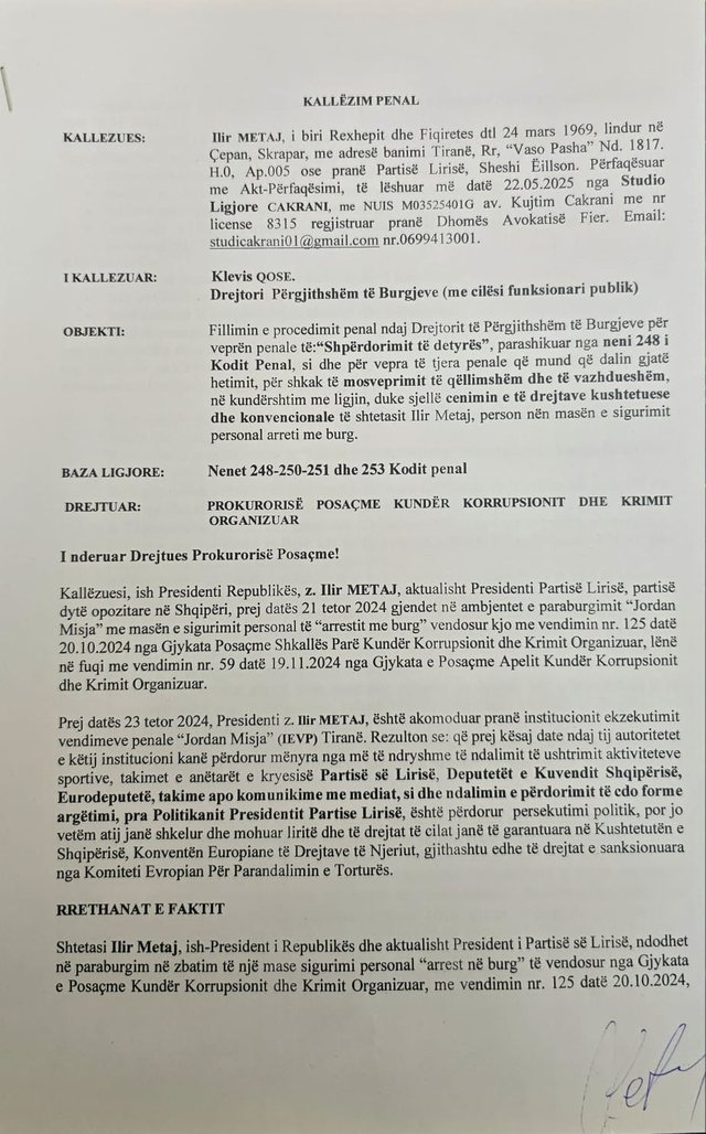 Në shkresën dërguar Prokurorisë së Posaçme thuhet se Qose ka shpërdoruar detyrën në disa raste, me veprimet apo mosveprimet e tij, duke i cënuar të drejtat dhe liritë Ilir Metës.