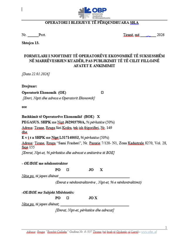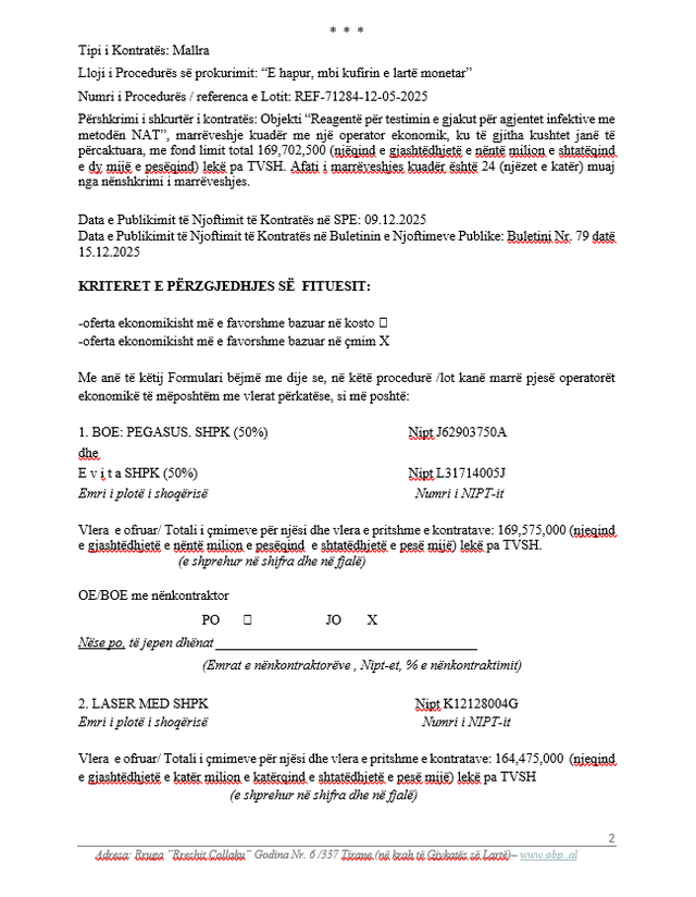 Por për të shpallur subjektet në fjalë, Operatori i Blerjeve të Përqendruara ka skualifikuar kompaninë tjetër pjesëmarrëse në garë, “Laser Med” sh.p.k, e cila kishte paraqitur ofertën më të ulët ekonomike.