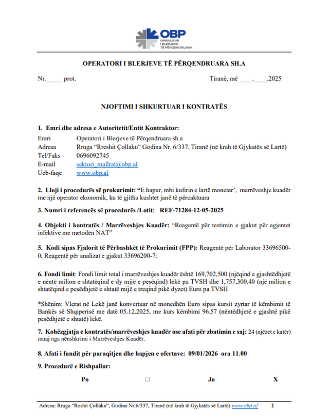 Tenderi ka për qëllim furnizimin e Qendrës Kombëtare të Transfuzionit të Gjakut me lëndë që futet në pajisje laboratorike të cilat shërbejnë për kontrollin e gjakut dhe zbulimin e viruseve infektive përpara transfuzioneve.