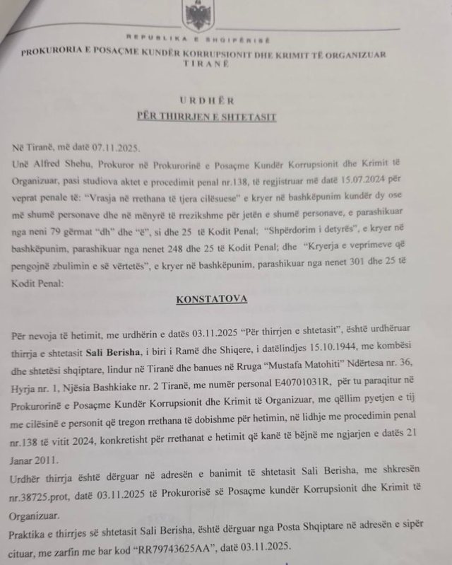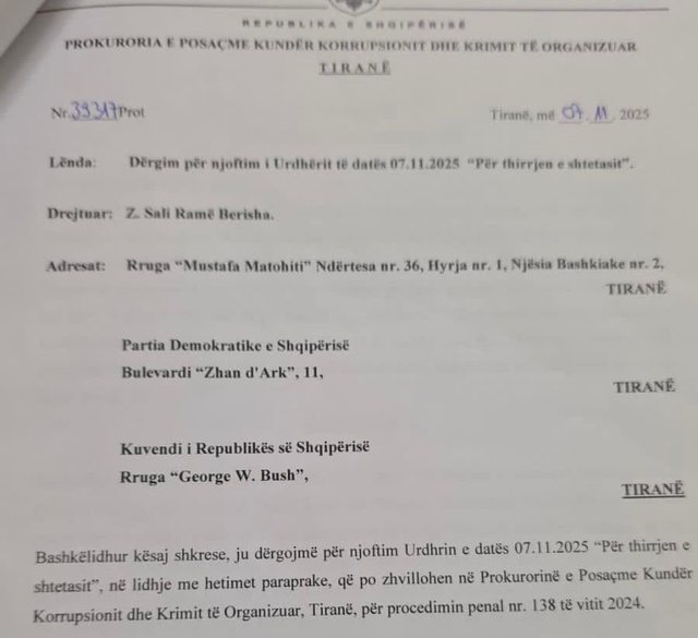 Prokuroria e Posaçme i ka dërguar fletëthirrje në tre adresa në banesë, në PD dhe në Kuvend. Dokumenti është bërë publik dhe nga disa media. Pavarësisht kësaj Berisha la të kuptohet se nuk do të paraqitet nesër, duke rikthyer një skemë të njohur të vonesave të tij në raport me paraqitjet para Prokurorisë së Posaçme, e ngjashme me atë të çështjes “Partizani”.