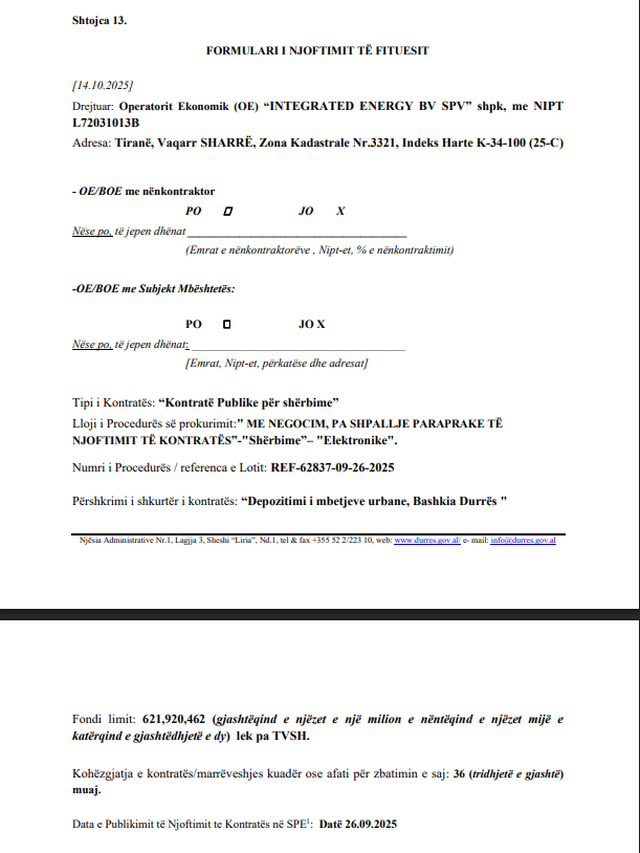 Gjithashtu, në tetor të vitit të kaluar, Bashkia Durrës i dha kompanisë “Integrated Energy Bv Spv” Shpk, 6.2 miliardë lekë të vjetra për “depozitimin e mbetjeve urbane” për tre vite. Kontrata jo vetëm u dha me negocim pa shpallje, por fituese ishte sërish kompania që aktualisht është nën hetim dhe sekuestro nga SPAK për aferën e inceneratorëve.