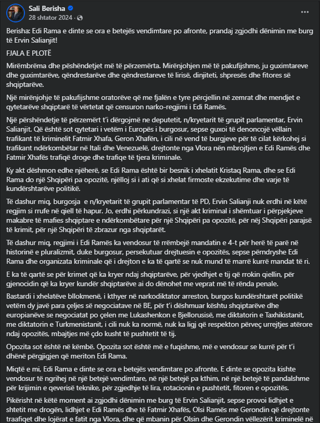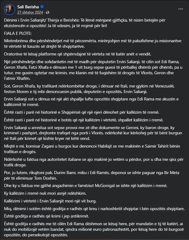“Një përshëndetje të përzemërt t’i dërgojmë ne deputetit, Ervin Salianjit. Që është sot qytetari i vetëm i Europës i burgosur, sepse guxoi të denoncojë vëllain trafikant të kriminelit Fatmir Xhafa, Geron Xhafën. Ky akt dëshmon edhe njëherë, se Edi Rama është bir besnik i xhelatit Kristaq Rama, dhe se Edi Rama do një Shqipëri pa opozitë, njëlloj si i ati që si xhelat firmoste ekzekutime dhe varje të kundërshtarëve politikë”.