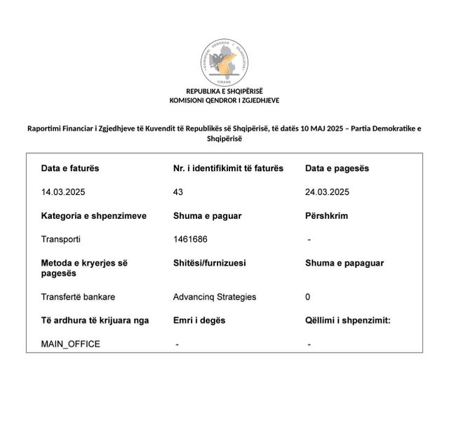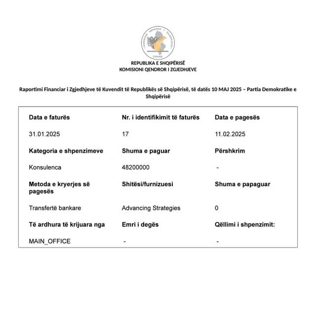 Sipas dokumentit zyrtar, pagesat ndaj kompanisë së LaCivitës, “Advancing Strategies”, janë kryer në katër këste, më 11 shkurt, 16 mars, 24 mars dhe 26 maj 2025. Shumat përkatëse të faturave variojnë nga 435 mijë deri në 482 mijë lekë, duke përbërë në total mbi 139 milionë lekë.