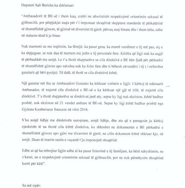 Kujtojmë se një ditë më parë, gjatë seancës plenare, Berisha u shpreh kundër projektligjit për barazinë gjinore.