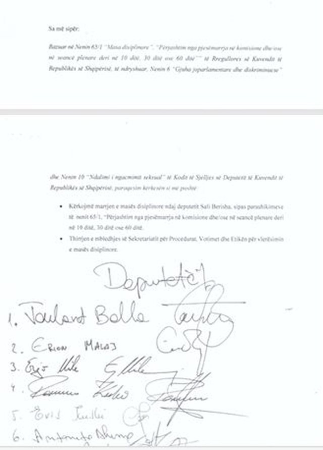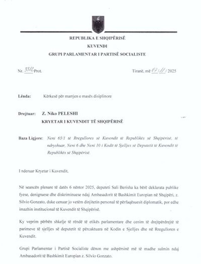 Grupi Parlamentar i Partisë Socialiste ka paraqitur një kërkesë për përjashtimin deri në 60 ditë nga Kuvendi të deputetit Sali Berisha. Sipas socialistëve, kreu i Partisë Demokratike ka përdorur gjuhë fyese dhe ofenduese ndaj ambasadorit të Bashkimit Europian në Tiranë, Silvio Gonzato. PS e argumenton këtë masë si një ndëshkim për përdorimin e një fjalori të papërshtatshëm në sallën plenare.