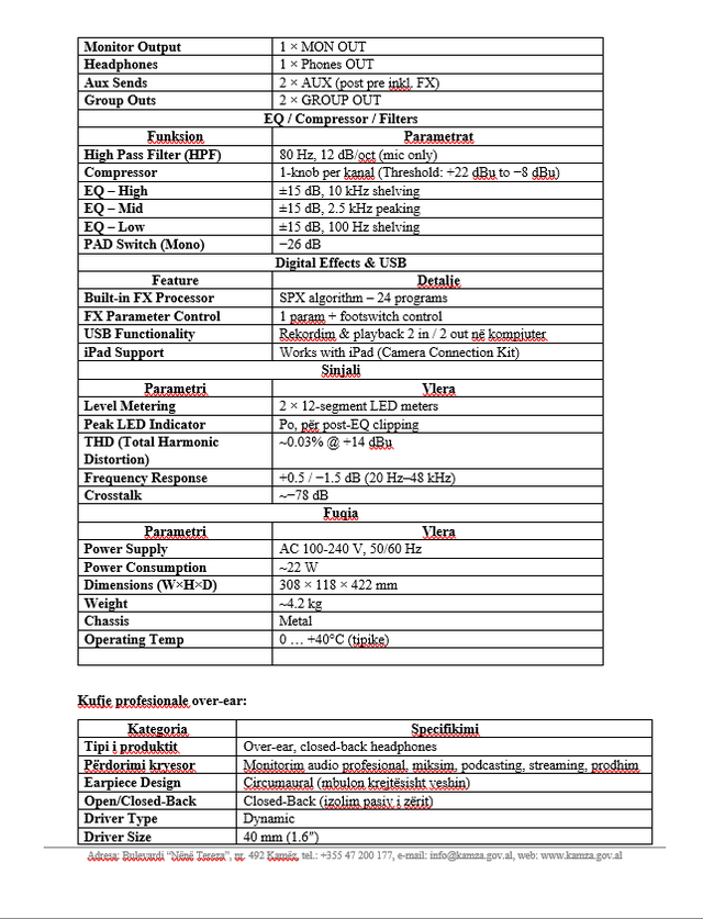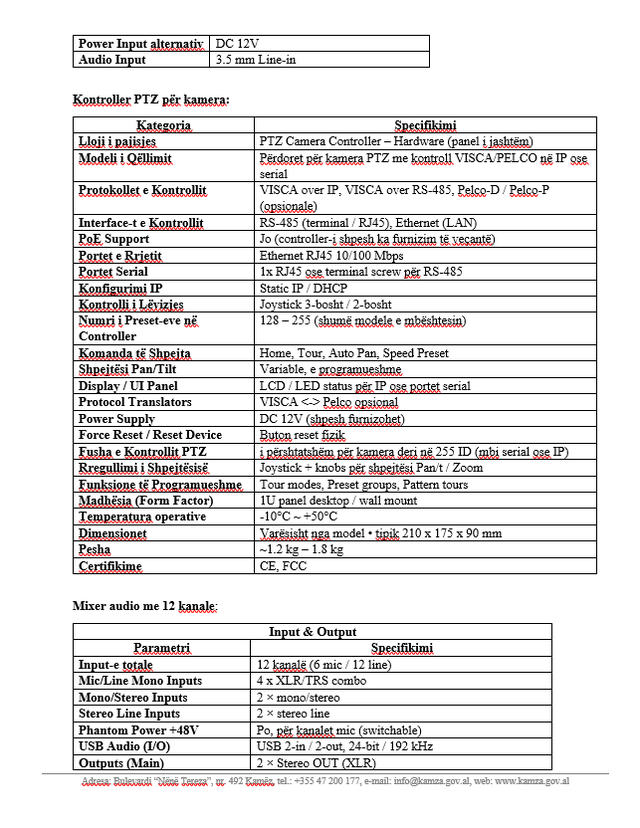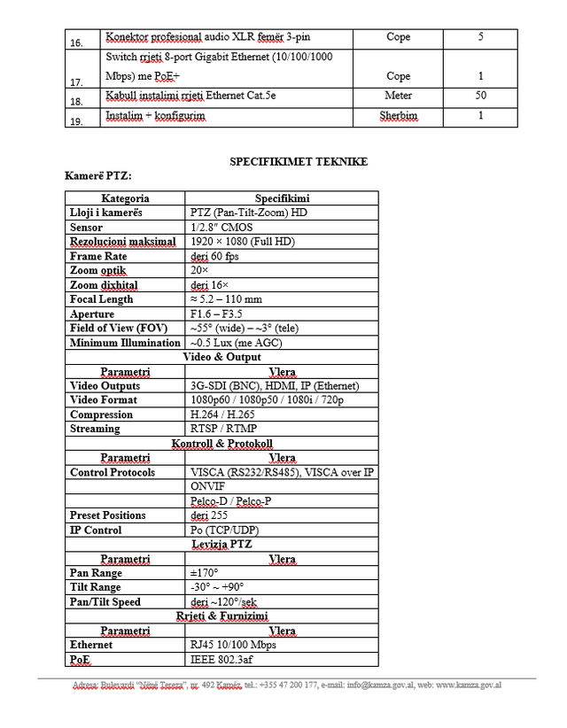 Sipas dokumenteve, kërkohet të blihen 3 kamera PTZ, një kontroller PTZ për kamera, dhe një mixer audio me 12 kanale. Bashkia ka kërkuar gjithashtu kufje profesionale, 5 mikrofonë për podcasting dhe 5 krahë mbajtës për mikrofonë.