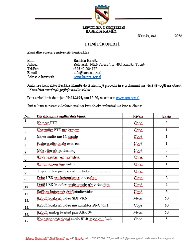 Bashkia Kamëz ka shpallur një tender me objekt “furnizim dhe vendosje pajisjesh audio-video”. Procedura është futur në kategorinë “vlerë e vogël”, që do të thotë se oferta do të paraqitet nga operatorët që shfaqin interes, dhe bashkia do të paguajë pasi të përmbushen kërkesat.