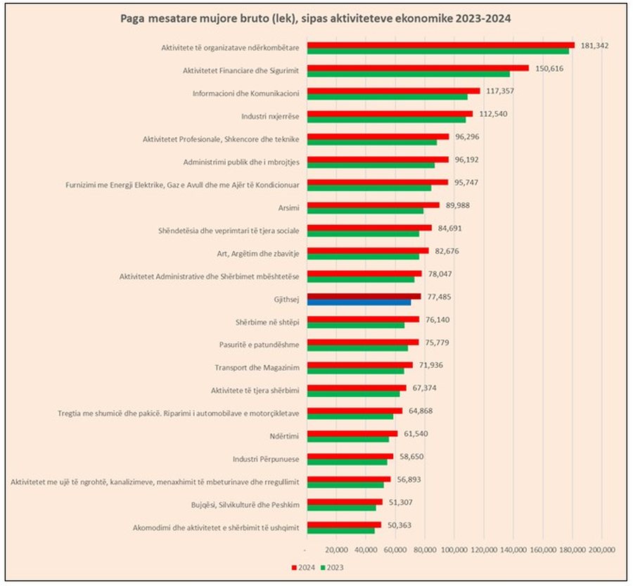 Vitin e kaluar, paga mesatare mujore bruto sipas deklarimeve nga listëpagesat në tatime arriti në 77,4 mijë lekë, me rritje 9.8% në krahasim me vitin 2023.