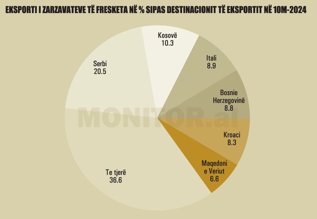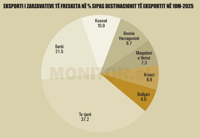 Të dhënat tregojnë qartë se struktura e eksporteve të zarzavateve shqiptare mbetet e përqendruar kryesisht në tregun rajonal, duke reflektuar një varësi të fortë nga vendet fqinje dhe Ballkani Perëndimor.