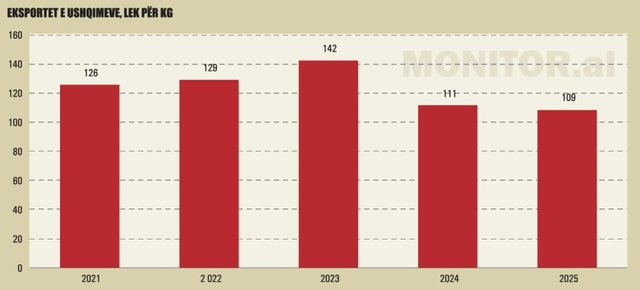 Në 10-mujorin 2025, një kilogram fruta dhe zarzavate u shit nga eksportuesit me 64.9 lekë, sipas të dhënave të INSTAT, por në nëntor dhe dhjetor, çmimet janë edhe më të ulëta. Në vitin 2023, çmimi për kilogram ishte 76 lekë duke arritur nivelin më të lartë historik dhe pas kësaj po vjen me ulje.