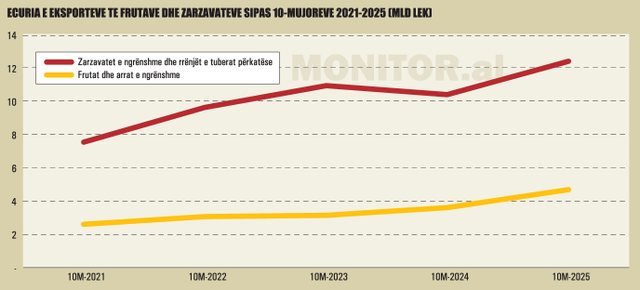 Të dhënat e periudhës 2021–2025 tregojnë rritje të qëndrueshme dhe të fortë të eksporteve të zarzavateve dhe frutave, ku totali është zgjeruar me rreth 70%. Vlera e tyre arriti në mbi 17.1 miliardë lekë në 10-mujorin e 2025-s, nga 10.1 miliardë lekë në të njëjtën periudhë të vitit 2021.