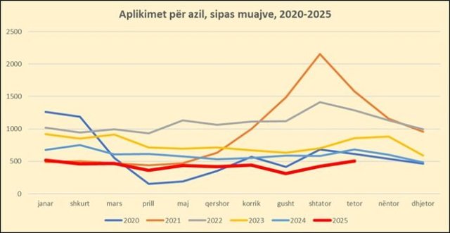 Sipas të dhënave të publikuara nga INSTAT, në tetor 2025 u regjistruan gjithsej 505 kërkesa për azil, që është niveli më i lartë që nga muaji janar. Në gusht numri i kërkesave ishte rënë në 315.