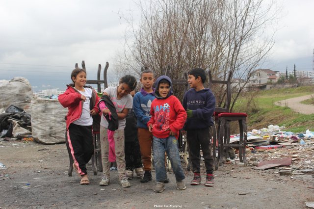 Fëmijë të komunitetit rom në një lagje të varfër në fund të Bulevardit të Ri, në kontrast të fortë me rritjen marramendëse të çmimeve të apartamenteve përreth.
