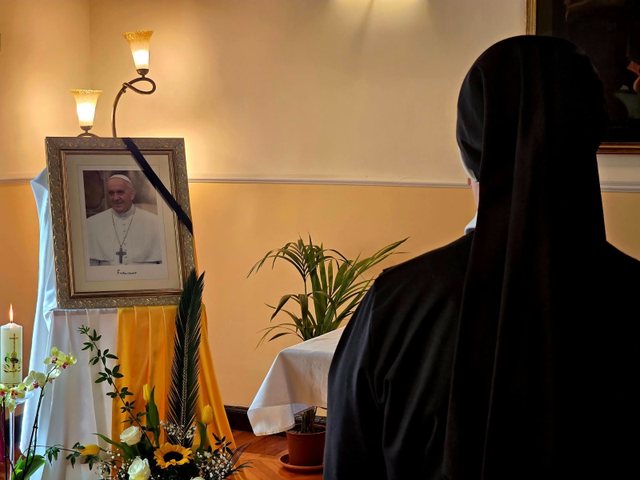 Një murgeshë qëndron në heshtje përpara fotografisë së Papa Françesku në Ambasadën e Vatikanit në Tiranë, një ditë pas ndarjes nga jeta të Papës së parë jezuit në historinë e Kishës Katolike.
