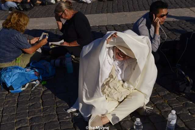 Një grua mbulohet për t’iu shmangur diellit dhe temperaturave ekstreme në Sheshin e Shën Pjetrit, ndërsa besimtarët presin daljen e tymit të bardhë nga Kapela Sistine që simbolizon zgjedhjen e një Pape të ri.