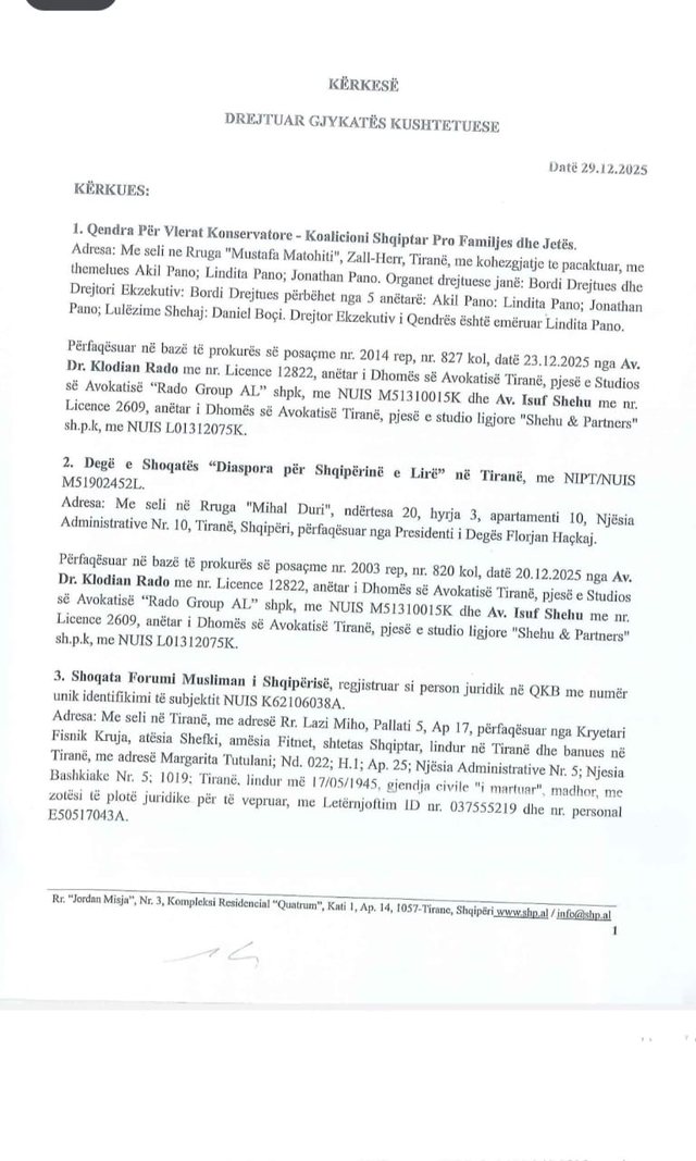 Kërkesa është bërë nga tri organizatat, konkretisht Qendra për Vlerat Konservatore, Koalicioni Shqiptar Pro Familjes dhe Jetës, Dega e Shoqatës “Diaspora për Shqipërinë e Lirë” në Tiranë dhe Shoqata Forumi Musliman i Shqipërisë, të përfaqësuara nga avokatët Dr. Klodian Rado dhe Isuf Shehu.