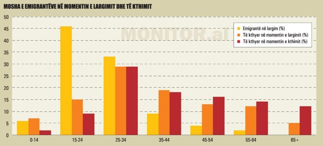 Emigrantët aktualë janë të përqendruar kryesisht në grupmoshën 25–44 vjeç, duke reflektuar motivimet ekonomike që nxisin vendimet për migrim. Gati tre të katërtat e emigrantëve janë meshkuj, me pabarazi gjinore veçanërisht të theksuara në destinacionet europiane si Mbretëria e Bashkuar, Greqia dhe Gjermania.