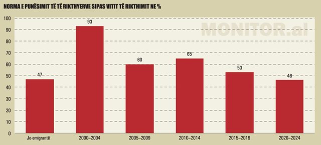 Norma më e ulët e punësimit, 46%, vërehet tek emigrantët e kthyer në periudhën 2020–2024, duke treguar sfida më të mëdha për riintegrimin afatshkurtër në tregun e punës.