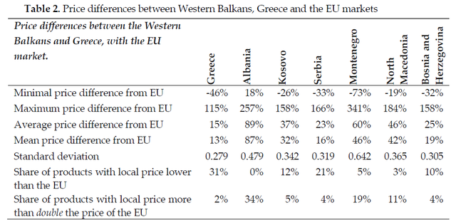 Në Shqipëri, çmimet ishin më të lartat, me një mesatare prej 89% më shumë se në tregun bazë të BE-së, e ndjekur nga Mali i Zi me 60% dhe Maqedonia e Veriut me 46%. Kosova regjistron një rritje mesatare prej 37%, ndërsa Bosnja dhe Hercegovina (25%) dhe Serbia (23%) shfaqin diferenca më të vogla.
