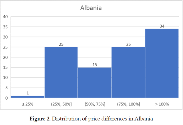Analiza e të dhënave të çmimeve për Shqipërinë tregon se, pas normalizimit për ndryshimet në TVSH, çmimet e produkteve në Shqipëri janë mesatarisht 89 për qind më të larta se ato të të njëjtave produkte të shitura nga e njëjta kompani në vendin e saj të origjinës, me një diferencë mesatare prej 87 për qind dhe devijim standard prej 0.48. Asnjë produkt nuk është shitur në Shqipëri me çmim më të ulët sesa në vendin amë të kompanisë. Rreth 34 për qind e produkteve janë shitur në Shqipëri me më shumë se dyfishin e çmimit që kanë të njëjtat produkte në vendin bazë. Diferenca minimale e çmimit në Shqipëri është 18% më e lartë, ndërsa ka artikuj që janë deri në 257% më shtrenjtë./ekofin.al
